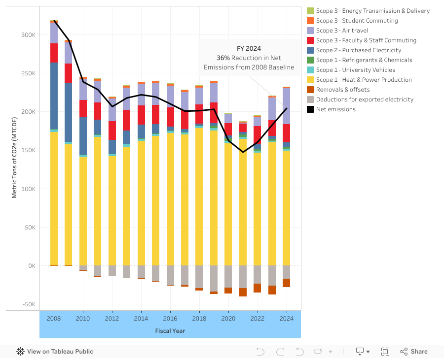 FY2020 and FY2021 show a reduction in emissions of over 50% from the 2008 baseline data represents disrupted operations during the COVID-19 pandemic including reduced campus density, and reduced faculty & staff commuting and business air travel. As operations normalized from disruption post-pandemic in FY2022, GHG emissions have risen to reflect a return to on-campus teaching and operations as well as more typical air travel.
