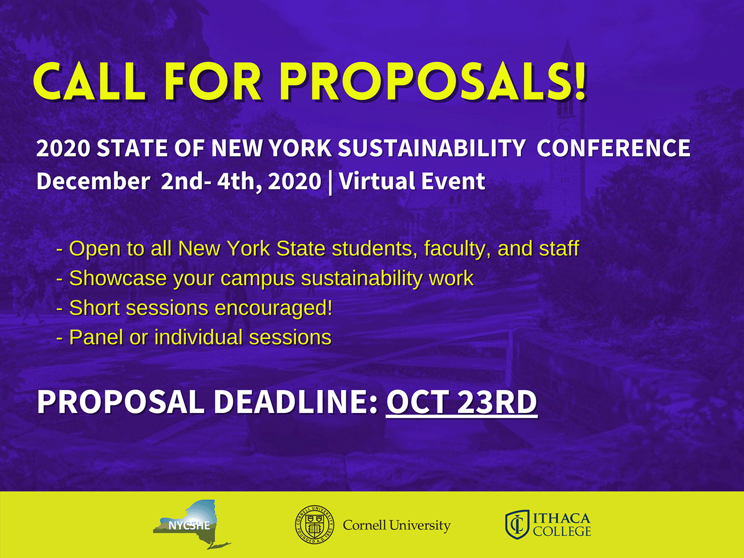 The New York Coalition for Sustainability in Higher Education (NYCSHE), Cornell University, Ithaca College, and the Conference Steering Committee are pleased to invite state-wide participation in the tenth annual State of NY Sustainability Conference. The conference will be held on December 2nd-4th, 2020, and bring together faculty, staff, and students from private and public higher education institutions from across New York State for a virtual event. Registration is open through November 30th, 2020.